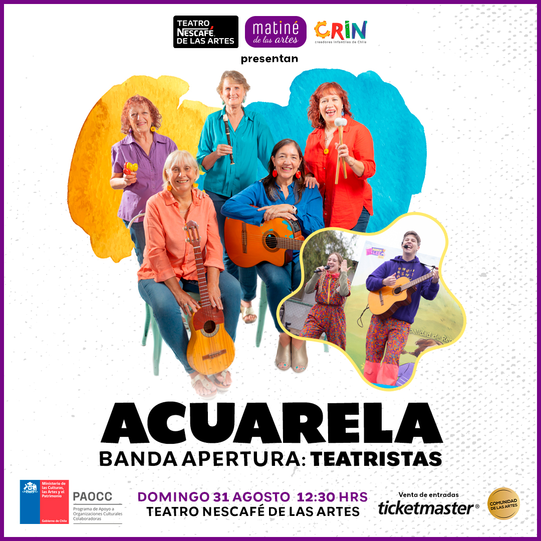 Teatro Nescafé de las Artes y la Asociación Gremial de Creadores Infantiles de Chile, CRIN Chile, presentan una nueva jornada del programa para infancias «Matiné de las Artes». En esta ocasión, el concierto de la banda Acuarela se presentará el domingo 31 de agosto, a las 12:30 horas.