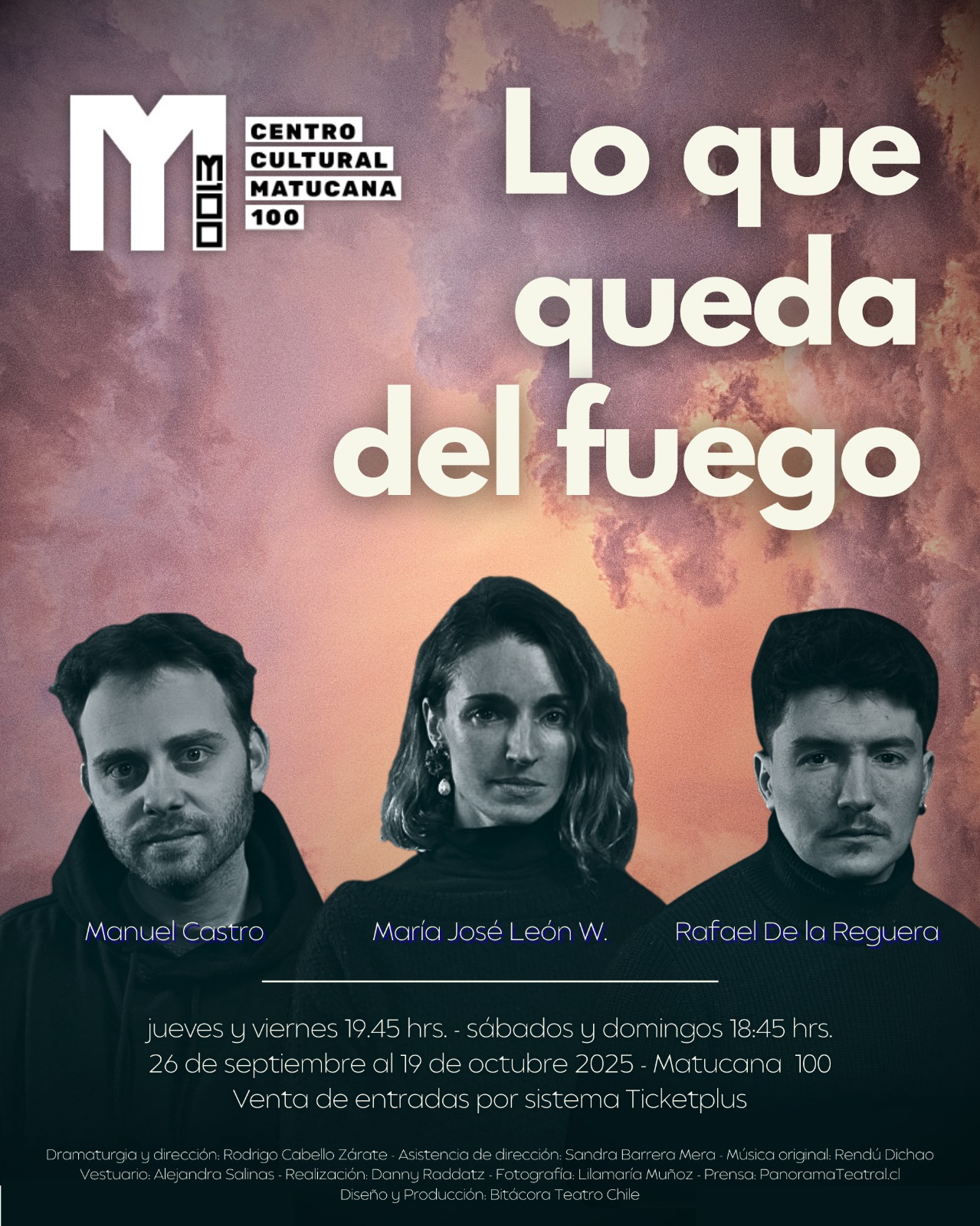Lo Que Queda Del Fuego” se presentará desde el 26 de septiembre hasta el 19 de octubre en la Microsala de Matucana 100, con funciones los jueves y viernes a las 19:45 hrs., y los sábados y domingos a las 18:45 hrs.