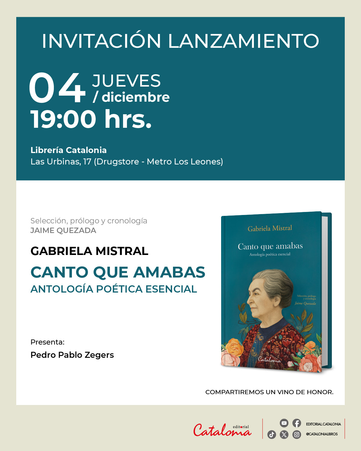 * El destacado mistraliano Jaime Quezada, reúne en esta obra textos fundamentales e inéditos, muchos poco conocidos o dispersos en revistas y periódicos, para descubrir y redescubrir a la premio Nobel en una sola edición. * A partir de cuatro libros esenciales —Desolación, Ternura, Tala, Lagar— y el póstumo Poema de Chile, la obra subraya los temas centrales de Mistral: la vida, la educación, lo social, lo religioso, lo femenino, lo chileno y lo americano. * En el aniversario 80 de la entrega del Nobel, este libro es una puerta de entrada para nuevos lectores y un volumen de referencia para sus seguidores. * Será presentado por Pedro Pablo Zegers, reconocido estudioso de Gabriela Mistral, el jueves 4 de diciembre, a las 19.00 horas, en librería Catalonia Las Urbinas 17 (Drugstore). Invitación abierta. * Disponible en librerías y canales digitales, formatos impreso e Ebook. |