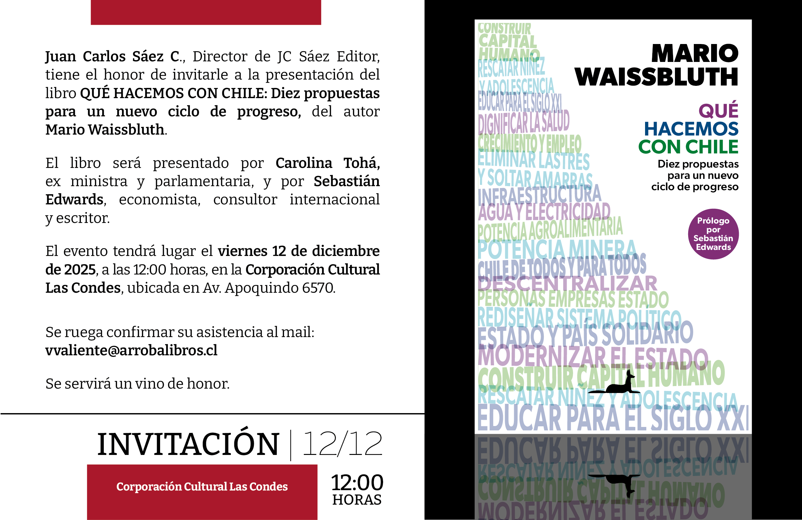 El próximo viernes 12 de diciembre a las 12 horas, se realizará el lanzamiento del libro “QUÉ HACEMOS CON CHILE: Diez propuestas para un nuevo ciclo de progreso” del autor Mario Waissbluth, en la Corporación Cultural de Las Condes, ubicada en Av. Apoquindo 6570.