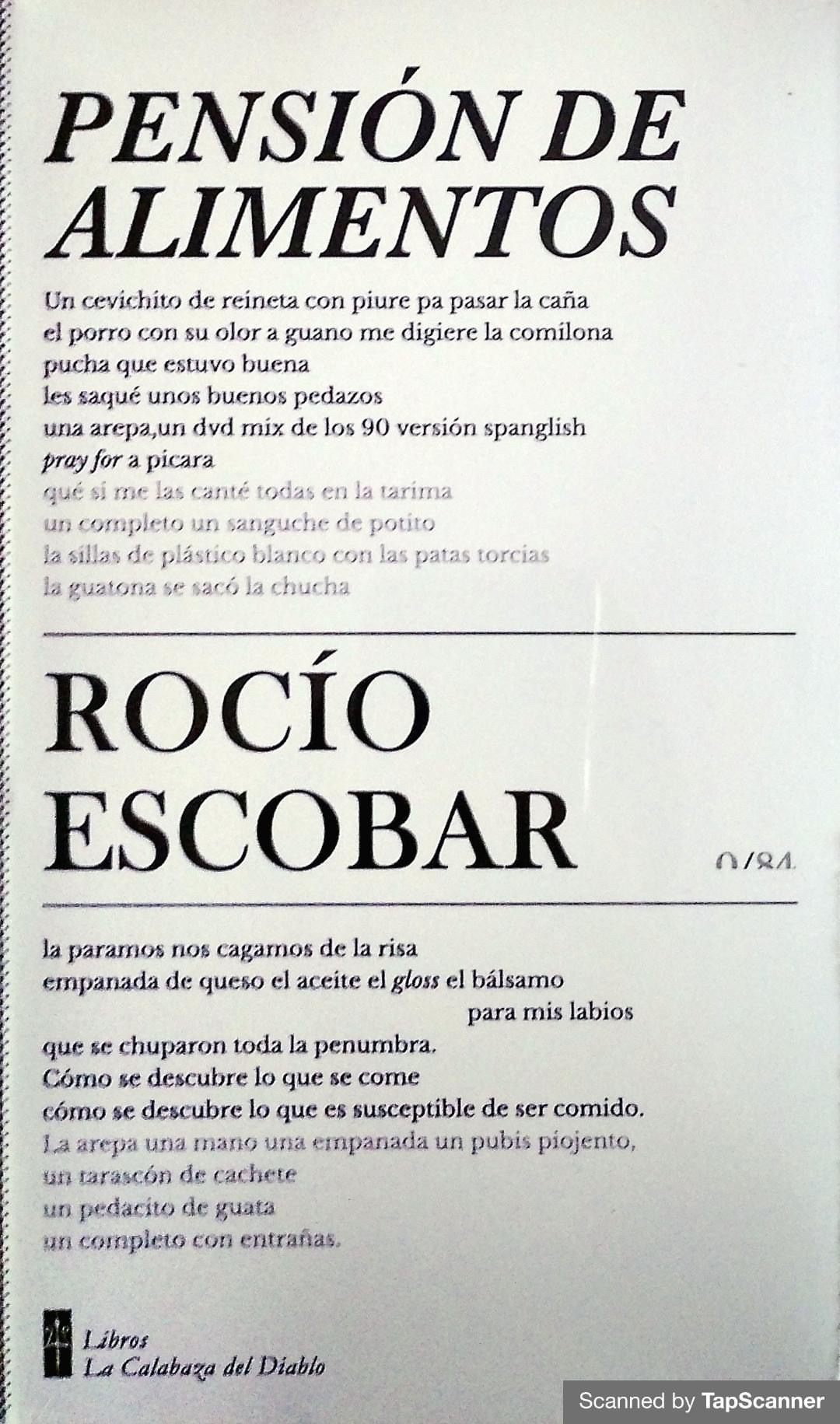 En medio de un tiempo donde la literatura pareciera inspirarse en la languidez de las plantas de departamento, donde el estilo de la poesía norteamericana parece imponer una voz pulcra, que a veces roza la intención sanitizante, estableciendo normas y lineamientos que permean la estructura en la cual se desenvuelve el llamado «campo cultural chileno». En este contexto, como un rayo oscuro, la poesía de Escobar atraviesa y quebranta los esquemas gringos (o canadienses), irrumpiendo para iluminar la sombra que, como un manto donosiano, está allí esperando, lista para correr el tupido velo. Por consiguiente, Pensión de alimentos opera como una carta de Tarot, específicamente La Torre, con su rayo negro lapidario. Así, el relámpago de Escobar rompe con la Torre de marfil de la academia, y su poder destructor reside en el lenguaje, en sus palabras eléctricas y punzantes. Sin miedo, desacralizando la lengua sanitizada que rige cómo (y sobre qué) se debe escribir: «Kristeva dijo, / tus dobles te han de ampliar las fauces / o te han de reducir a palabras / no, le digo / yo soy el bastardísimo ciervo sediento / que bebe del agua viva». La poesía de Rocío desacraliza el artificio del lenguaje, es movimiento, como ella misma dice, repetición, en un vaivén entre un tango matizado con erotismo, pasando por piezas líricas de voces que se escuchan en las calles o la Iglesia, hasta la gótica danza de un ritual ocultista.