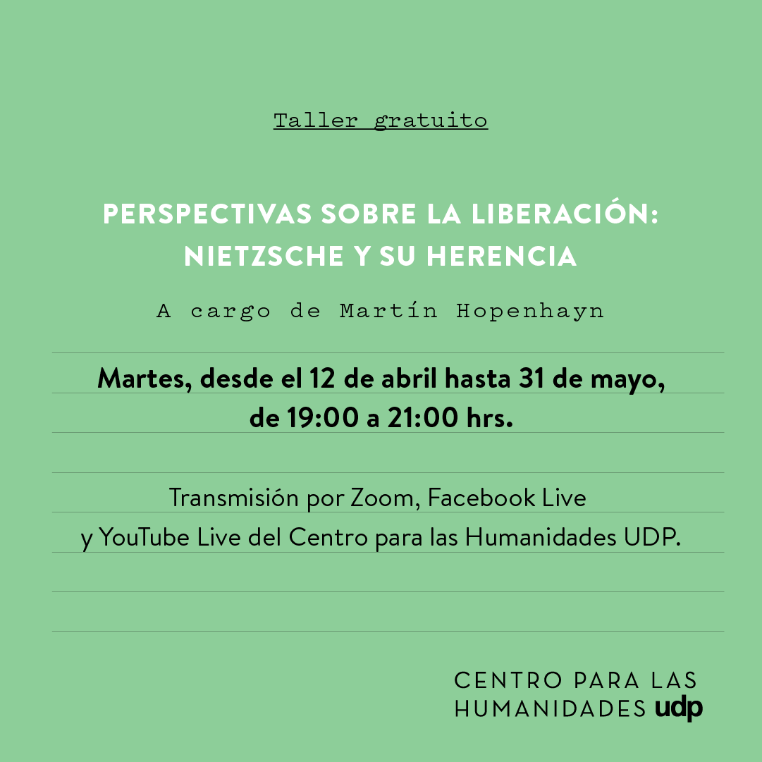 Llenando Vacíos Slider Taller: Perspectivas sobre la liberación: Nietzsche y su herencia Sebastián Novajas marzo 24, 2022 No hay comentarios
